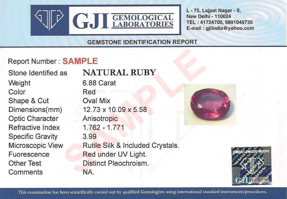 Gemstones are identified on the basis of their Physical & Optical properties and GJI is fully equipped for this. Each Gemstone is examined very carefully by our professional Gemologists using internationally accepted Procedures and Tools. This report provides a detailed description of a stone's Natural or Synthetic origin, its Physical and Optical properties, color, shape, cut, clarity and carat weight. Additionally, the report also fully discloses any kind of treatment or enhancement present. Each Report has the photograph of the stone mentioned in the Report for Identification.